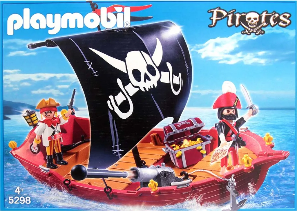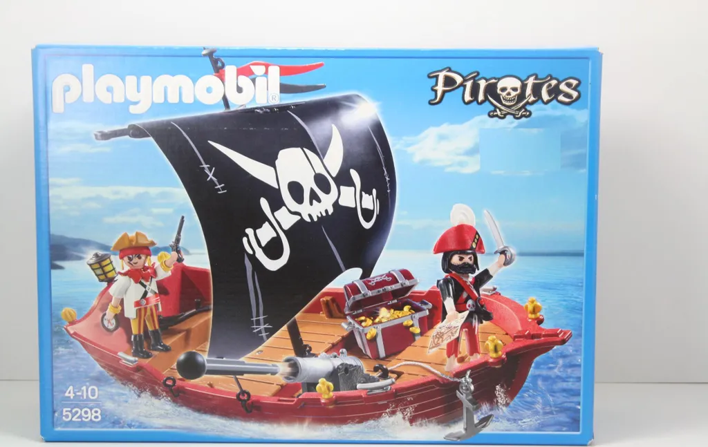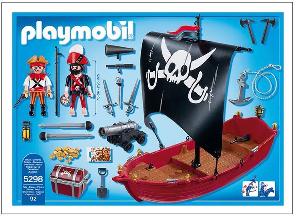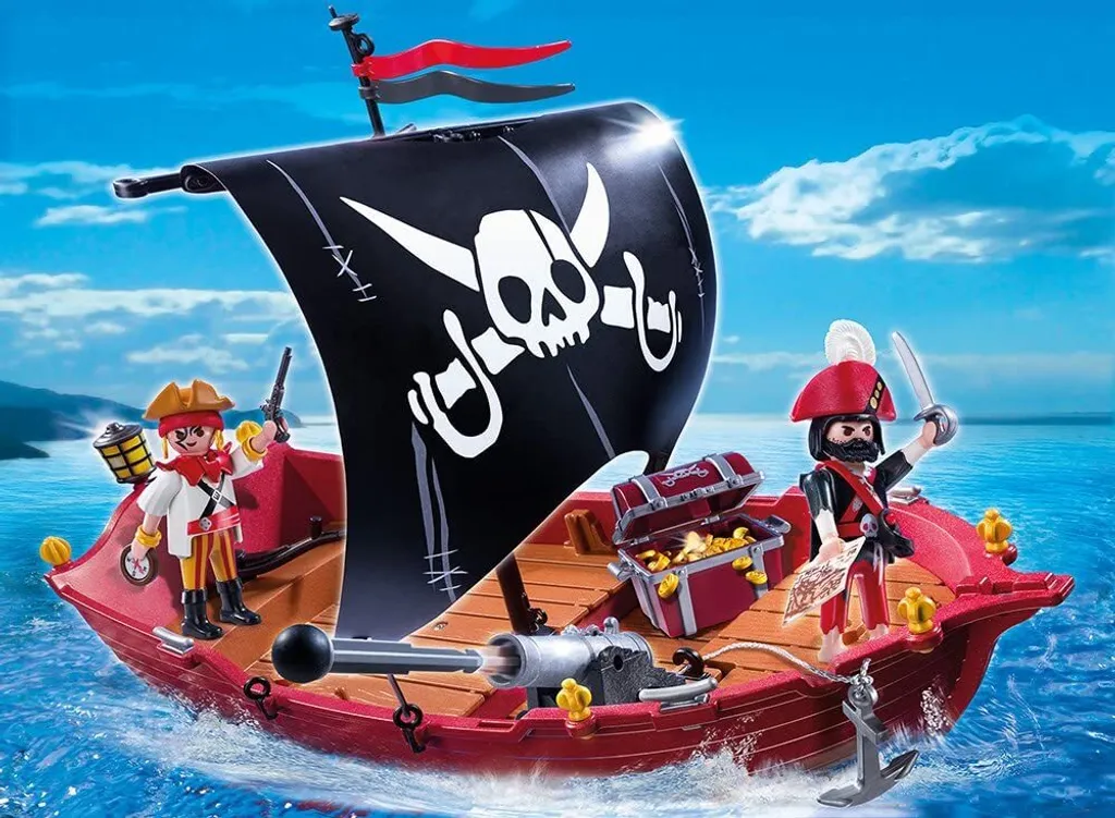 Lieferumfang: 2 Figuren, Segelboot mit Totenkopfsegel, Kanone, Schatztruhe mit Goldmünzen, Fernrohr, Kompass, Karte, Schwerter, Schaufel, Enterhaken
