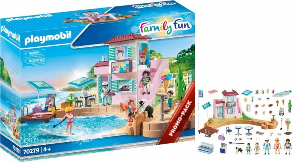 - Contenido: 1x PLAYMOBIL Family Fun Heladería en el Puerto, Set de 108 piezas con instrucciones: 1 heladería, 5 figuras, 102 accesorios, Material: plástico, Medidas de construcción (LxAxA) aprox.: 65x35x23 cm, 70279