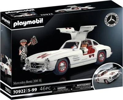 Der Mercedes-Benz 300 SL: ein Sportwagenklassiker mit besonderer Aura jetzt im PLAYMOBIL-Format. Bei seiner Vorstellung auf der International Motor Sports Show in New York 1954 galt der Mercedes-Benz 300 SL als schnellster Sportwagen seiner Zeit, denn er erreichte Spitzengeschwindigkeiten von 228 km/h. Mercedes-Benz 300 SL von PLAYMOBIL mit Flügeltüren Stoßstangen, Kühlergrill und Radkappen in Chromoptik 46 Teile aus robustem Kunststoff ab 5 Jahren geeignet Mit seinen Flügeltüren, der Benzin-Direkteinspritzung und seinem Gitterrohrrahmen besitzt der 300 SL einen Wiedererkennungswert wie kein anderes Fahrzeug. Das Erfolgsrezept des 300 SL ist seine perfekte Mischung aus raubeinigem Rennsportcharakter mit einer Prise Luxus und Extravaganz. Für die nötige Eleganz sorgen die Anbauteile in edler Chromoptik. Nun erscheint der Traumsportwagen des 20. Jahrhunderts als PLAYMOBIL-Version natürlich mit den legendären Flügeltüren zum Aufklappen, Elementen wie Stoßstangen, Kühlergrill und Radkappen in Chromoptik und tollen Accessoires im 50er Jahre Look. Zum Einsetzen der Figuren werden die Flügeltüren nach oben geklappt. Der Werkzeugkasten wird im Kofferraum verstaut. Mithilfe der Boxentafel wird der Fahrer während des Rennens über seine Position informiert. Sicherlich wird der Rennpilot mit seinem Mercedes-Benz 300 SL als erster über die Ziellinie fahren. Auf dem enthaltenen Präsentationsschild können die wichtigsten Daten des Oldtimers nachgelesen werden. Die Sportwagen-Ikone aus den 1950er Jahren mit den legendären Flügeltüren: Jetzt auch von PLAYMOBIL, ausgestattet mit Figuren und Accessoires in einer Rennsport-Szenerie der 1950er Jahre.