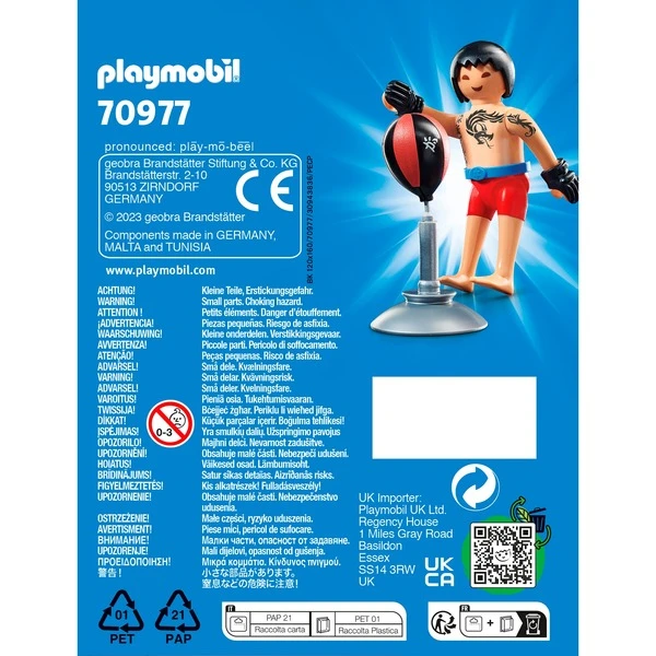 Mit den PLAYMOBIL-Figuren aus der Serie PLAYMO-Friends wird es nie langweilig! Der Kickboxer kommt mit einem Trainingsgerät und Boxhandschuhen. Seinen Oberkörper ziert ein stilvolles Drachen-Tattoo.Art.-Nr.: 1888945