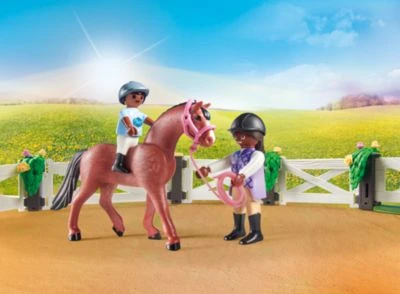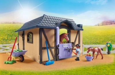 Im Reitstall ist immer viel los und jede Menge zu tun! Der Junge hat gerade erst die Stute und ihr Fohlen in den umzäunten Auslauf gebracht, um erstmal den Stall auszumisten. Mit Schubkarre, Besen und Heugabel macht er sich ans Werk. Mit dem umfassenden Spielset PLAYMOBIL® Reitstall (71238) können die schönsten Geschichten rund um die Pferde erzählt und nachgespielt werden. Ist die Arbeit getan, können der Junge und die Reiterin die friedlichen Pferde versorgen. Sie haben köstliche Karotten dabei und sogar das kleine Fohlen knabbert schon vorsichtig an frischem Grün. Heute möchte die Reiterin die Stute zum Reitunterricht mitnehmen. Beide freuen sich und das Pferd wird, nach dem Striegeln gesattelt. In dem Set enthalten ist ein Stallgebäude, das auf einer Seite offen ist und prima bespielt werden kann. Im Nebenraum zum Stall befinden sich Regale für die Verpflegung von Mensch und Tier und ein Zaunelement kann als Weidezaun für die beiden Pferde aufgestellt werden. Viele Zubehörteile sorgen für kreative Spielmomente und ganz viel Abwechslung.