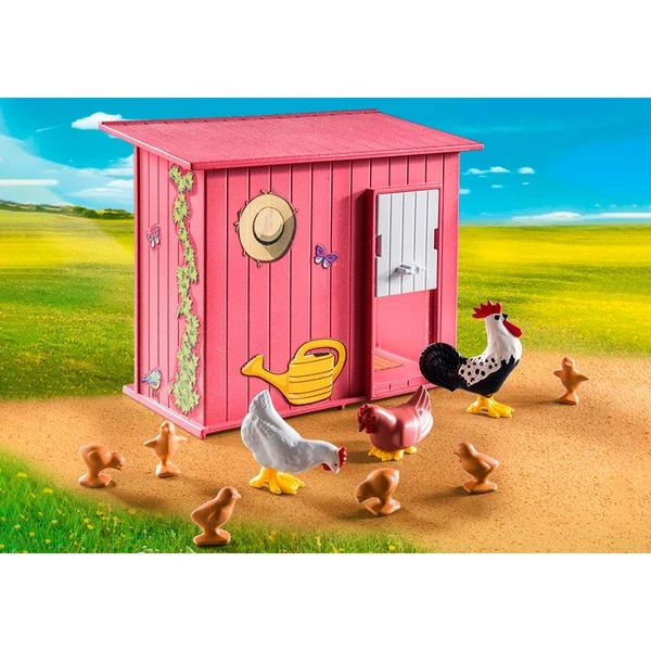 | Inhalt/Ausstattung | Figur: 1 Frau. Tiere: 6 Küken, 1 Hahn, 2 Hennen. Zubehör: 2x braune Eier, 4x weiße Eier, 3x Grasboden, 1 Hühnerhaus mit Einsatz und hochschiebbarer Tür, 1 Korb | ||