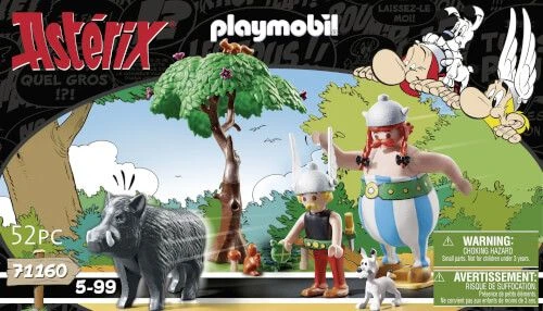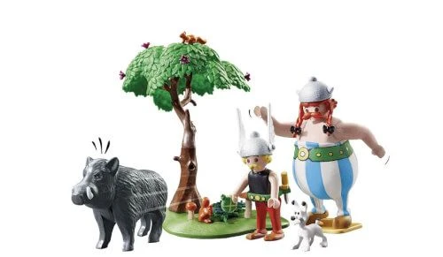 Das PLAYMOBIL-Set enthält die Gallier Asterix und Obelix, Hund Idefix, zwei Eichhörnchen und ein Wildschwein sowie einen Baum. Obelix kann das Wildschwein tragen und den umgefallenen Baum wieder aufstellen.