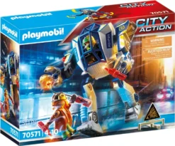 Für besonders brenzlige Spezialeinsätze nutzt die Polizei ihren praktischen Polizei-Roboter. Ein arglistiger Bankräuber versucht sich den Weg in die Bank mit Sprengsätzen frei zu räumen. Doch der Polizist steigt unerschrocken ins Cockpit des Roboters und begibt sich direkt in die Gefahrenzone. Geschickt steuert er den Roboter auf den Bösewicht zu und nimmt ihm mit dem Greifarm schnell den Sprengsatz aus der Hand. Anschließend wird der Feuerteufel auf dem schnellsten Weg ins nächstgelegene Polizeirevier transportiert.