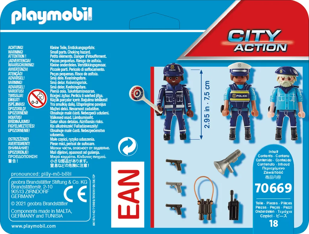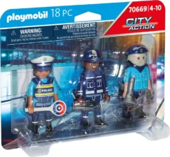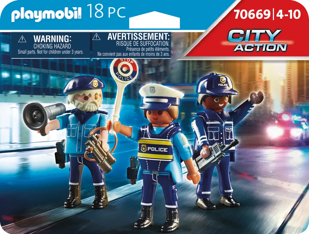 Verstärkung für das PLAYMOBIL-Polizeiteam gibt es mit dem Figurenset Polizei. Drei zusätzliche Polizeifiguren, ausgestattet mit Megaphon, Kelle, Funkgerät und weiteren Polizeiextras warten auf ihren Einsatz.