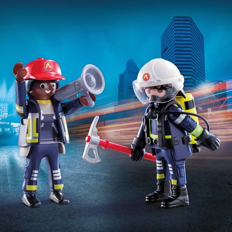 Auf zum Einsatz! Feuerwehrmann und -frau sind bestens ausgerüstet: Der Helm sitzt, die Axt ist dabei und die Atemmaske aufgesetzt. Es kann losgehen.PLAYMOBIL®-DuoPacks bieten großen Spielspaß zum kleinen Preis.