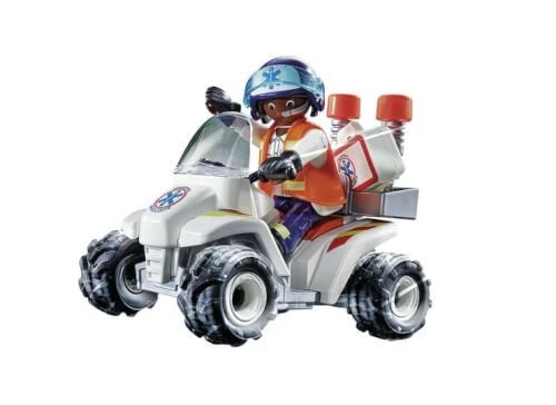 Das Set enthält eine PLAYMOBIL-Ärztin, ein Quad mit Rückzugsmotor, einen Arztkoffer mit Arztutensilien, Helm und Handschuhaufsätze.