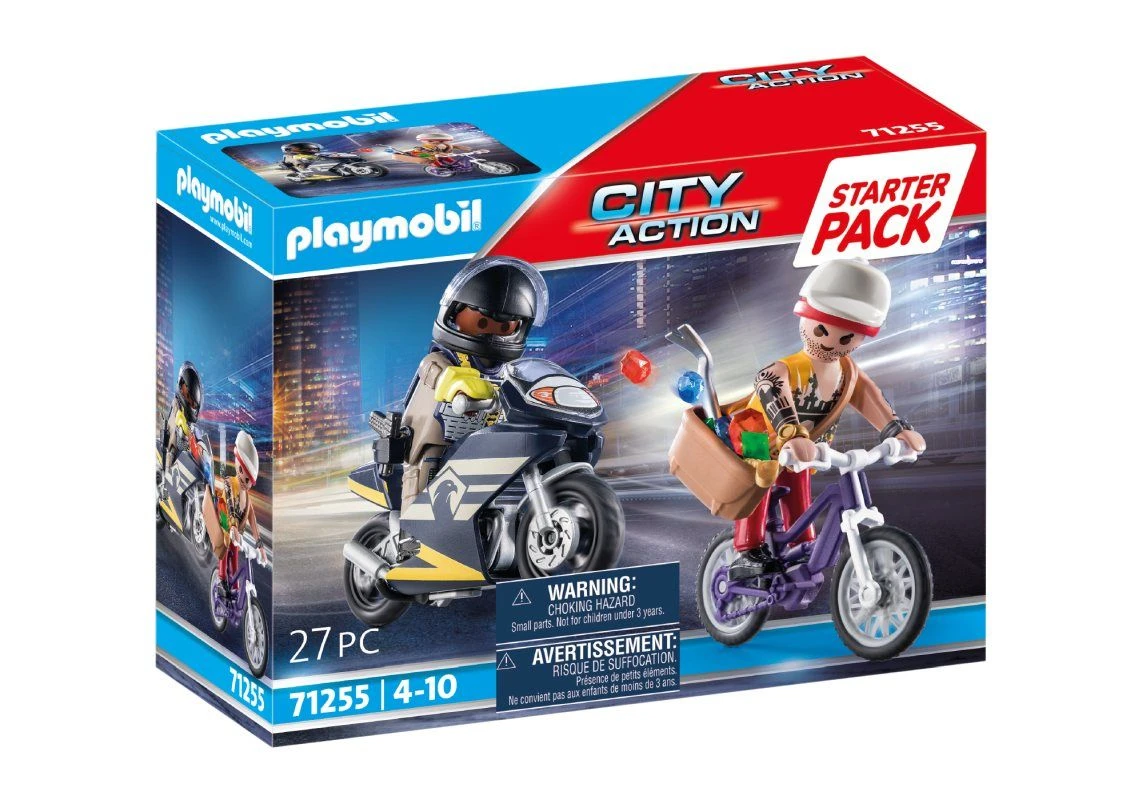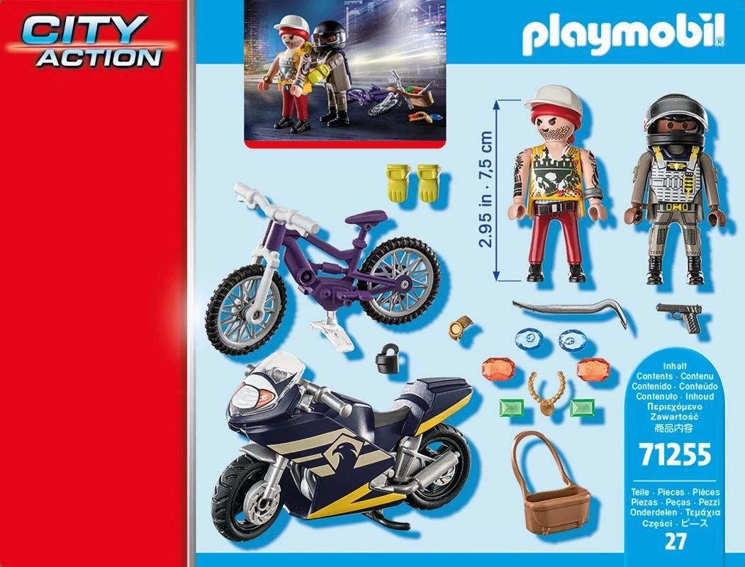 Figuren: 1 SEK Polizist, 1 Dieb Zubehör: 1 Motorrad, 1 Helm mit Visier, 1 Handschuhe, 1 Pistole, 1 Fahrrad, 1 Schirmmütze, 1 Tasche, 1 Brechstange, 6 Juwelen, 1 Armbanduhr
