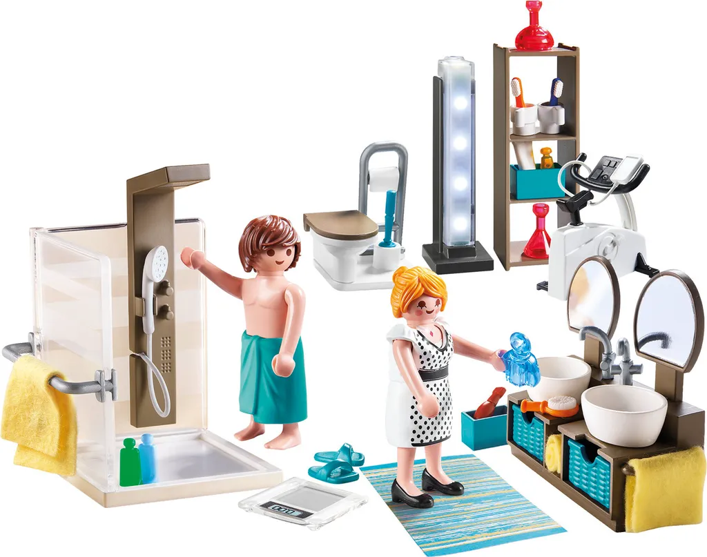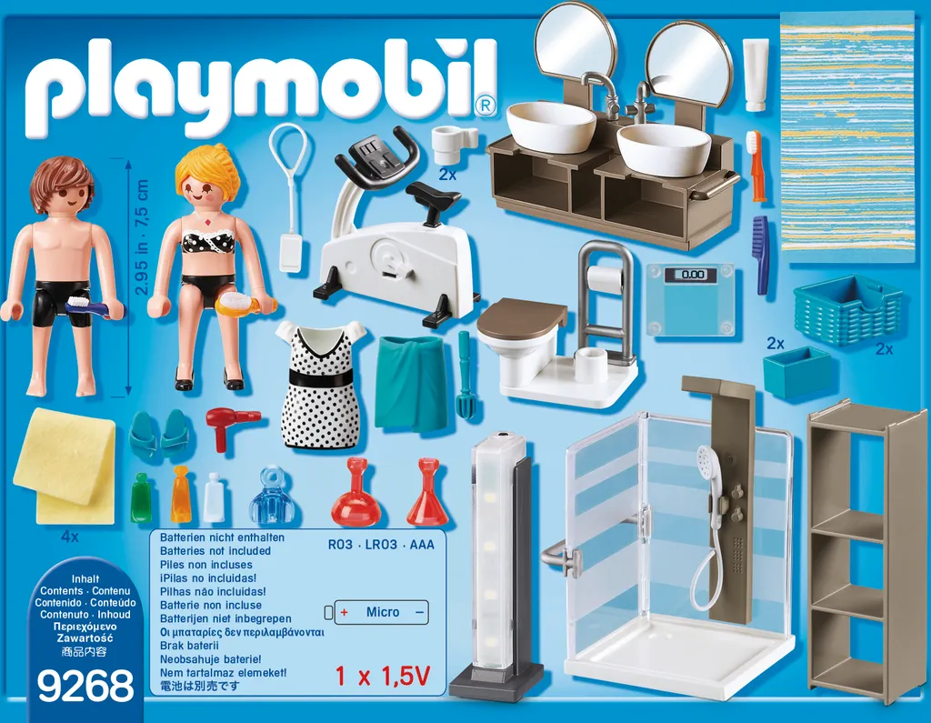 Zubehör: 1 Dusche, 1 Doppelwaschtisch, 1 Lichtsäule, 1 Toilette, 1 Heimtrainer, 1 Regal, 1 Kleid, 1 Badetuch, 1 Waage, 4 Handtücher, 2 Kisten, 2 Körbe, 1 Paar Badeschlappen, 1 MP3-Player, 2 Flakons, 3 Kosmetikflaschen, 1 Tube, 2 Zahnbürsten, 1 Parfumflakon, 2 Becher, 1 Klobürste, 1 Teppich, 1 Haarbürste, 1 Kamm, 1 Fön