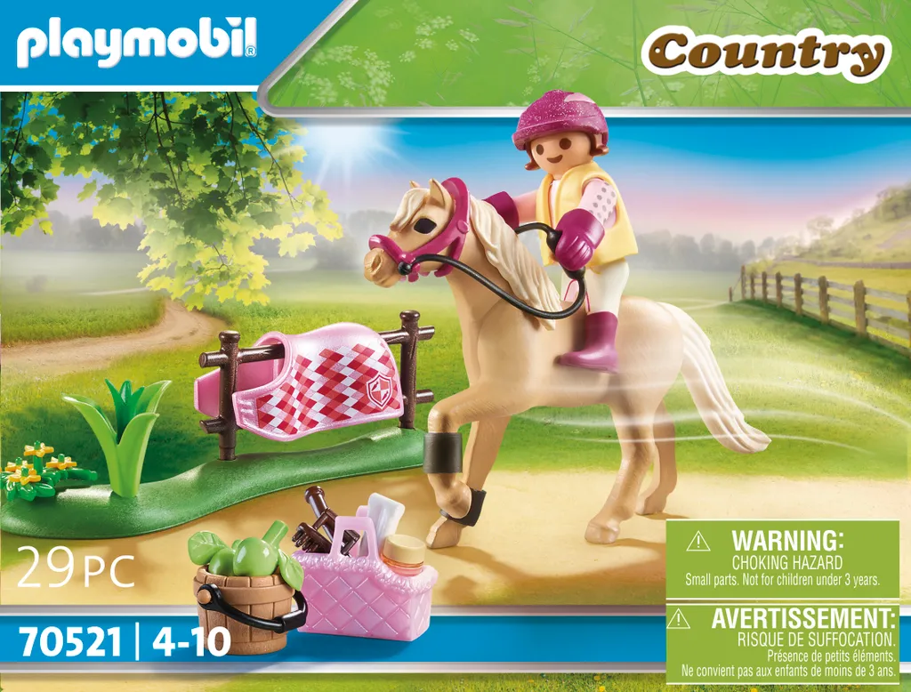 Das Spielset enthält eine Mädchenfigur, ein deutsches Reitpony, Reitkappe, Pferdedecke, Tasche, Eimer, Zaumzeug, Bürste und viele weitere liebevolle Extras. Reitdecke und Accessoires sind farblich aufeinander abgestimmt.