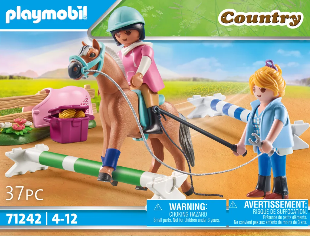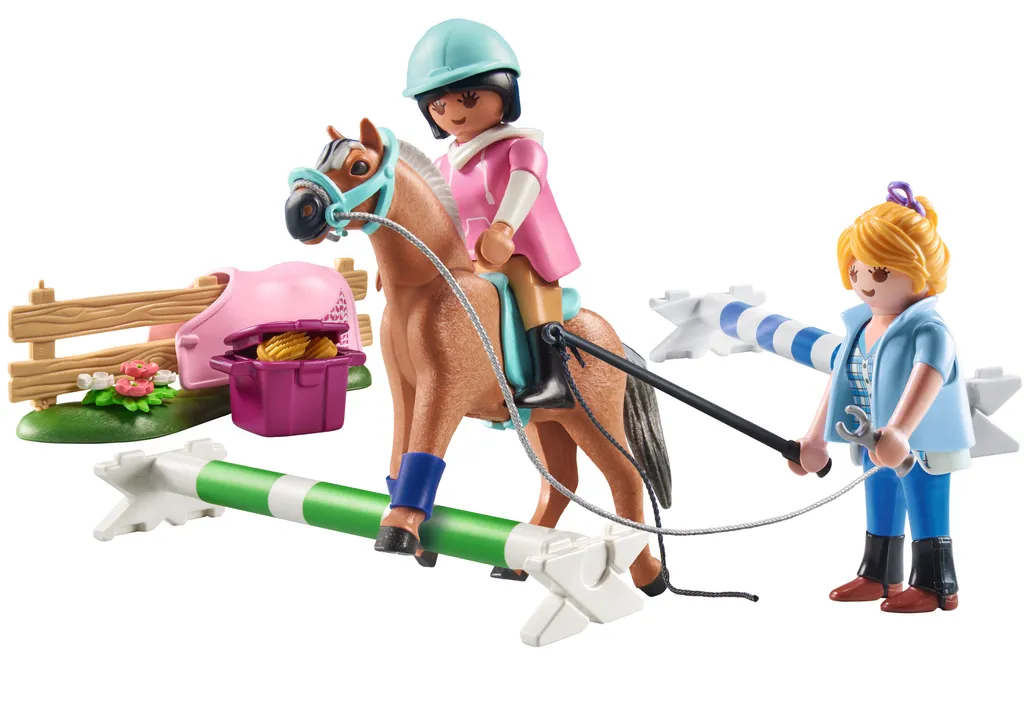 Großen Spaß für Pferdefans gibt es mit dem tollen PLAYMOBIL-Spielset Reitunterricht. Auf der Trainingskoppel übt die Reitlehrerin mit ihrer Schülerin das Springreiten. Dazu werden die drei Stangen als Sprungpodest übereinandergestapelt. Gefühlvoll nähert sich die Reiterin auf ihrem Pferd dem Hindernis und überspringt es mit Leichtigkeit.