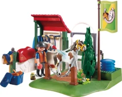 Zubehör: 3 Cavaletti, 1 Zaun, 1 Blumenwiese, 1 Pferdedecke, 1 Sattel, 1 Halfter, 1 Zügel, 1 Rechen, 1 Schaufel, 1 Pferdeäpfel, 1 Aufbewahrungsbox, 1 Striegelkammset, 1 Reiterhelm, 1 Peitsche, 1 Ranke, 4 Bandagen