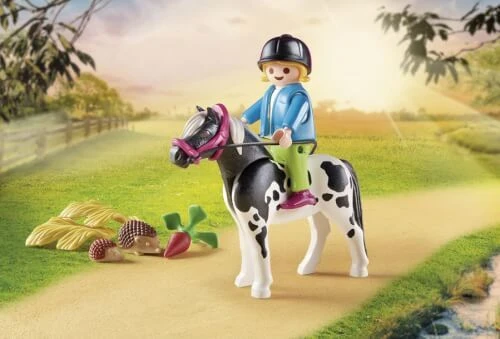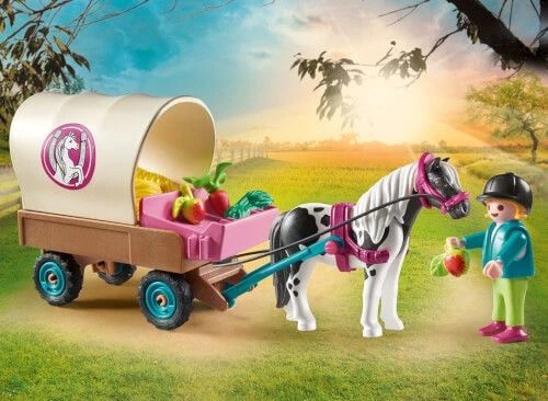 Das kleine Mädchen nutzt das gute Wetter für einen Ausflug mit der Ponykutsche. Bevor es losgeht, lädt das Mädchen frisches Futter für das Pony auf die Ladefläche der Kutsche. Dann spannt es die Plane über die Ladefläche, setzt seinen Reithelm auf und nimmt auf dem Kutschbock Platz. Die Fahrt kann losgehen. Das Spielset enthält eine PLAYMOBIL-Kinderfigur, ein Pony, zwei Igel, eine Kutsche, einen Reiterhelm und viele weitere liebevolle Extras für tollen Pferdespielspaß.