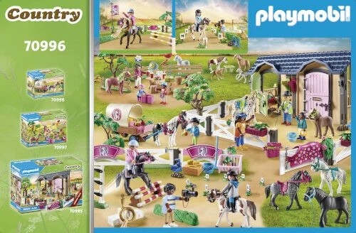 Das Spielset enthält drei PLAYMOBIL-Figuren, zwei Pferde, zwei Hasen, Halfter, Zaunelemente, verschiedene Hindernisse, zwei Turnierschleifen, ein Siegerpodest und viele weitere Extras für spannende Reitturniere. Die Zaunelemente können frei platziert werden. Mit den enthaltenen Buchstabenschildern kann ein Dressurparcours aufgestellt werden.