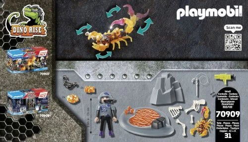Team Dino Rise hat immer alle Hände voll zu tun, um die finsteren Machenschaften der Comet Corporation zu durchkreuzen. Diesmal bekommt es Ian mit einem riesigen Feuerskorpion zu tun. Außer vor den riesigen Scherenarmen des Spinnentiers muss sich Ian auch vor seinem gefährlichen Stachelschwanz in Acht nehmen. Doch der Auserwählte hat schon eine Idee: Gekonnt schießt er einen Enterhaken auf den Kristall auf dem Rücken des Skorpions und zieht den Edelstein mit Schwung zu sich. So kann er den Kristall erbeuten, ohne gestochen zu werden. Was für ein cleveres Manöver! PLAYMOBIL Starter Packs eigenen sich ideal als Einstieg oder Ergänzung der vielen bunten PLAYMOBIL-Spielwelten. Das Set enthält Team Dino Rise Mitglied Ian, einen Feuerskorpion, vier kleine Skorpione, Helm, Schulterstutzen, Felsen, sechs Feuerkristalle und viele weitere Extras für aufregende Dinoabenteuer.
