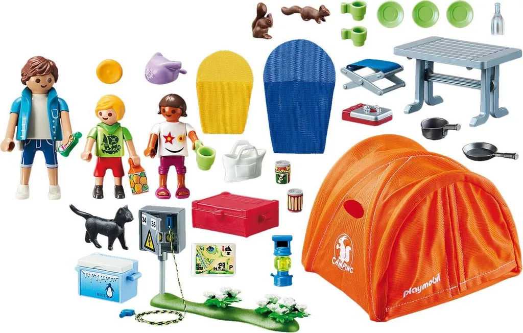 Figuren: 1 Mann, 1 Mädchen, 1 Junge Tiere: 1 Katze, 2 Eichhörnchen Zubehör: 1 Zelt, 1 Grünfläche mit Blumen und Stromkasten, 2 Schlafsäcke, 1 Campingtisch, 3 Campinghocker, 1 Flasche, 1 Gaslampe, 1 Tube, 1 Gaskocher, 1 Lageplan, 1 Pfanne, 1 Topf, 2 Konservendosen, 1 Safttüte, 3 Teller, 3 Tassen, 1 Frisbee, 1 Kühlbox, 1 Kiste, 1 Kopftuch.