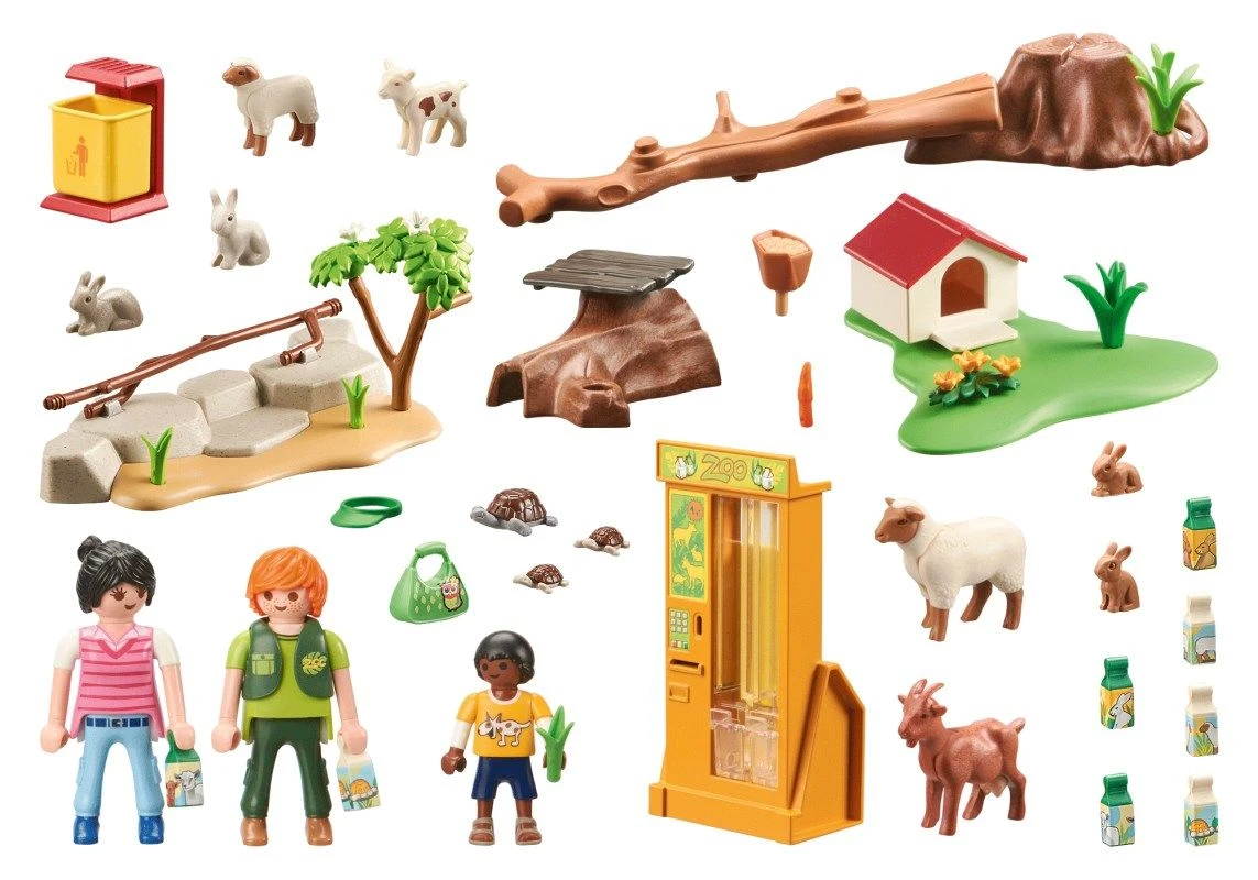 Ein liebevoll gestaltetes Spielset für tierliebe Kinder. Das Set enthält drei PLAYMOBIL-Figuren, eine Ziege mit Zicklein, ein Schaf mit Lamm, zwei Kaninchen mit Babys, eine Schildkröte, einen Futterautomaten, acht Futtertüten und viele weitere tolle Extras. Der Futterautomat ist funktionsfähig und kann immer wieder mit Tierfutter aufgefüllt werden. Das Spielset eignet sich ideal zur Erweiterung des großen Erlebnis-Zoos 71190.