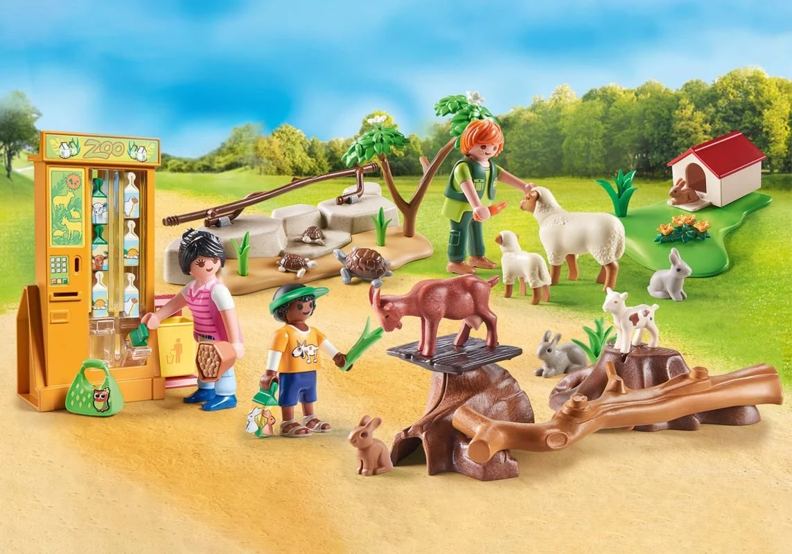 Im PLAYMOBIL Erlebnis-Streichelzoo kommen kleine Tierfreunde ihren Lieblingen ganz nahe. Zuerst kaufen sich die Besucher Futter am Automaten, dann geht es ab ins Gehege Tiere füttern und streicheln. Die Ziegen und Schafe freuen sich schon und springen aufgeregt herum. Natürlich werden auch die Schildkröten und Kaninchen nicht vergessen.