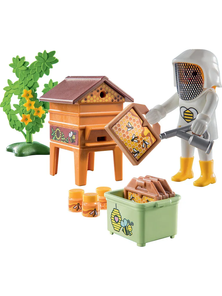 Imkerinnen und Imker befassen sich mit der Haltung, Züchtung und Vermehrung von Honigbienen und mit der Honigproduktion. Mit dem PLAYMOBIL-Spielset Imkerin können Kinder in die spannende Welt des Bienenzüchtens und der Honigproduktion eintauchen.