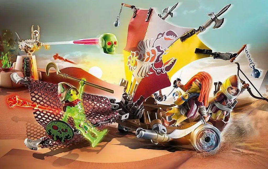 Im wendigen PLAYMOBIL Dünensurfer machen sich die Aharis in der Wüste auf die Jagd. Es dauert nicht lange, und schon entdecken sie einen Skelettkrieger, der sich hinter einem Felsen versteckt und sich mit einer Kanone verteidigt. Doch nicht mit den Wüstenkämpfern! Sie setzen das Segel, rauschen in Kurven um den Felsen herum, klappen das Netz herunter und tatsächlich: der Krieger der Skelettarmee ist in ihren Fängen!