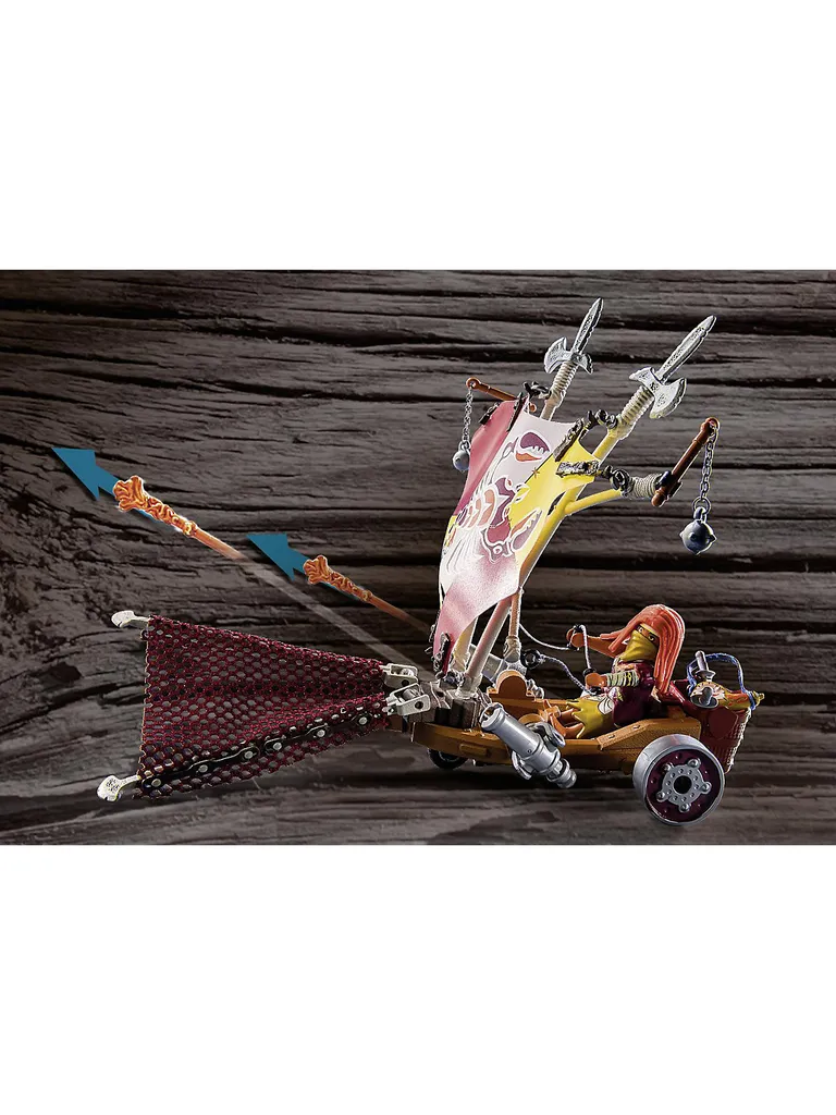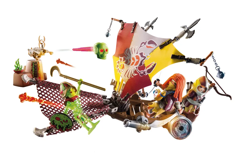 - Zubehör: 1 Fahrzeug, 2 Kanonen, 2 Giftgeschosse, 1 Mast, 1 Korb, 1 Fangnetz, 1 Felsen, 1 Bolzenkanone mit Knochen-Überzug, 2 Totenkopf-Geschosse, 1 Flammenhalter, 1 Flamme, 2 Kochen, 2 Doppelklingen, 2 Säbel, 1 Giftflasche mit Gurt, 1 Halstuch, 1 Helm, 1 Kampfstab, 1 Schild, 1 Umhang, 1 Haube, 1 Bogen, 1 Pfeil, 1 Köcher, 1 Gürtel, 1 Armmanschette, 1 Dolch, 1 Lasso, 1 Textil- Segel, 1 Schnur mit Griffen, 1 Etikettenbogen