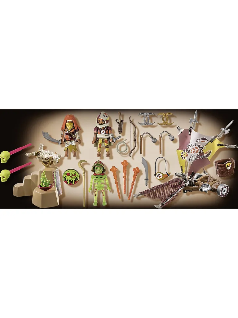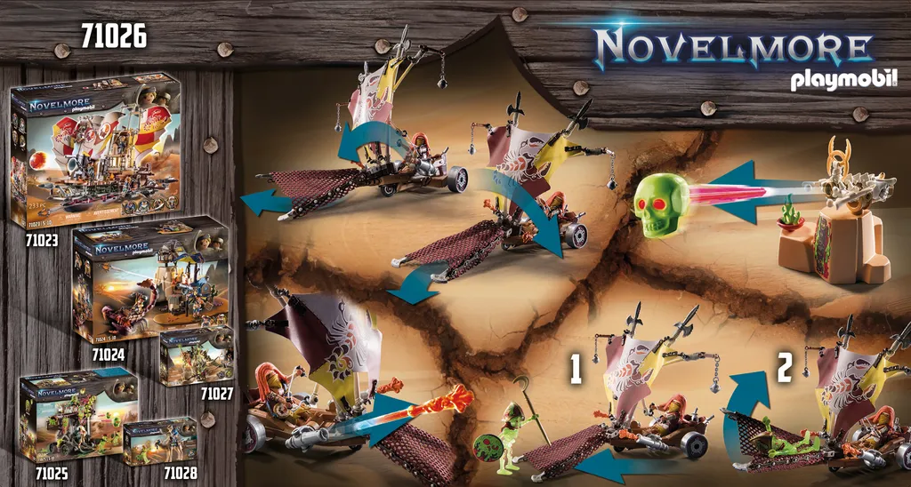 Das Abenteuer der rebellischen Burnham Raiders und der Novelmore Knights geht weiter. Denn nicht nur rund um die PLAYMOBIL Burg von Novelmore und in der Vulkanlandschaft der pyromanischen Raiders kommt es zu hitzigen Gefechten, auch in der Wüste von Sal’ahari Sands geht es „giftig“ zu. Gemeinsam mit dem Wüstenvolk der Ahari stellen sich die Novelmore-Ritter der schaurigen Skelettarmee entgegen: