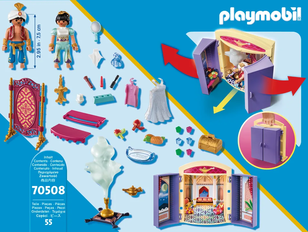 Der Orient, Ort sagenhafter Märchen und Legenden. Beim Durchstreifen des Palastes haben Prinz und Prinzessin eine geheimnisvolle Wunderlampe entdeckt. Als sie an ihr reiben, kommt ein wundersamer Geist zum Vorschein. Ob er den beiden wohl drei Wünsche erfüllt? PLAYMOBIL-Spielboxen bieten großen Spielspaß für unterwegs. Alle Figuren und Accessoires sind im Handumdrehen in der Box verstaut und durch den praktischen Tragegriff kann das Spielset kinderleicht überallhin mitgenommen werden.