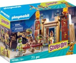 Erforsche zusammen mit Scooby-Doo™, Shaggy™ & Velma™ alte Pharaonengräber beim SCOOBY-DOO! Abenteuer in Ägypten. Um unentdeckt zu bleiben haben die Freunde ägyptische Gewänder angelegt. Velma und der Pharao tragen Kostüme im Mumienstil und können beide durch die wechselnden Gesichter enttarnt werden. Vorsicht bei den beiden verschlossenen Geheimtüren im Grabmal – wer weiß, ob dahinter nicht eine Mumie lauert oder ein Schatz darauf wartet, entdeckt zu werden! Die beiden enthaltenen Geisterkarten für den Gefangenen und Kleopatra können mit dem Sarg aus dem Geisterhaus oder dem Lesegerät in der Mystery Machine (70361 und 70286 – jeweils separat erhältlich) beleuchtet und gelesen werden. Scooby-Doo kann Dinge in den Mund nehmen und festhalten und die Standplatte ermöglicht es ihm, auf seinen Hinterbeinen zu stehen. Das Set enthält Scooby-Doo, Shaggy, Velma, Pharao mit wechselndem Gesicht, Grabeingang, Schlüssel zum Entriegeln der Geheimtüren, Sammel-Geisterkarten und viele andere altägyptische Accessoires.
