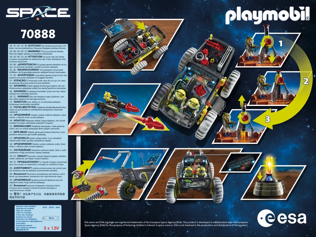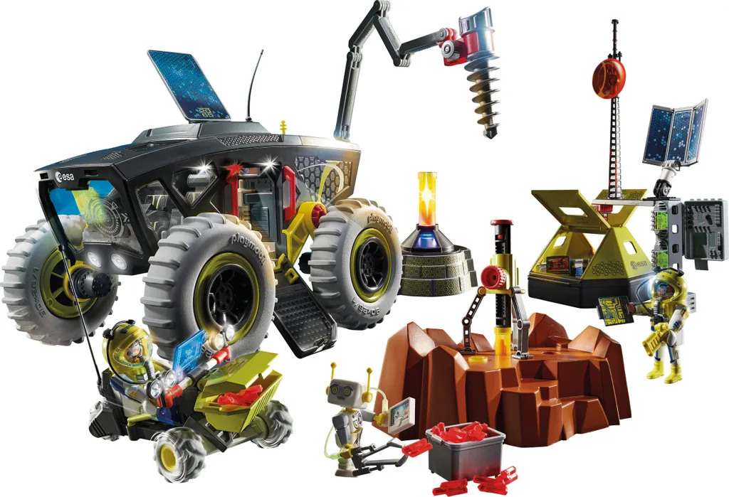 Das Spielset enth?lt zwei PLAYMOBIL-Astronauten, einen Mars-Rover mit Licht- und Soundmodul, ein Mars-Trike, eine Bohrstation, ein Forschungslabor, einen Roboter und viele weitere Extras fr spannende Marsmissionen. Armschienen und Astronautenhelme sind abnehmbar. Alle Licht- und Soundmechanismen verfgen ber automatische Power-Off-Funktionen.